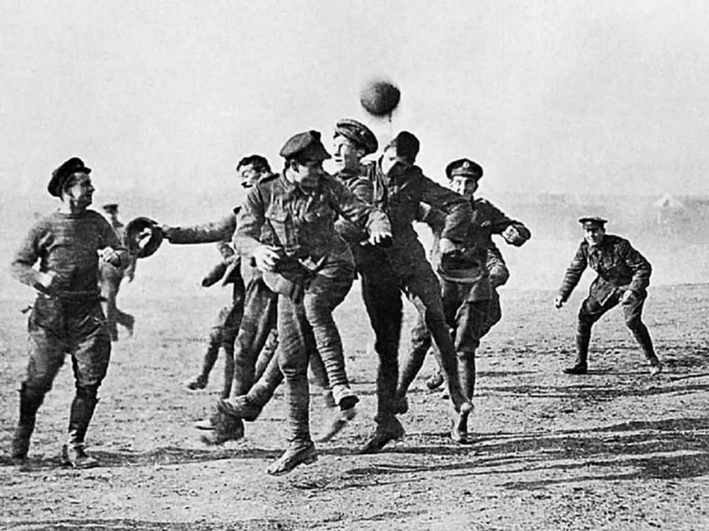 On into Christmas morning, the miracle continued. Soccer games stumbled on icy ground, the goalposts marked by soldiers’ caps. Scottish soldiers played in kilts, and “us Germans really roared when a gust of wind revealed that the Scots wore no drawers under their kilts—and hooted and whistled every time they caught an impudent glimpse of one posterior belonging to one of ‘yesterday’s enemies.’”